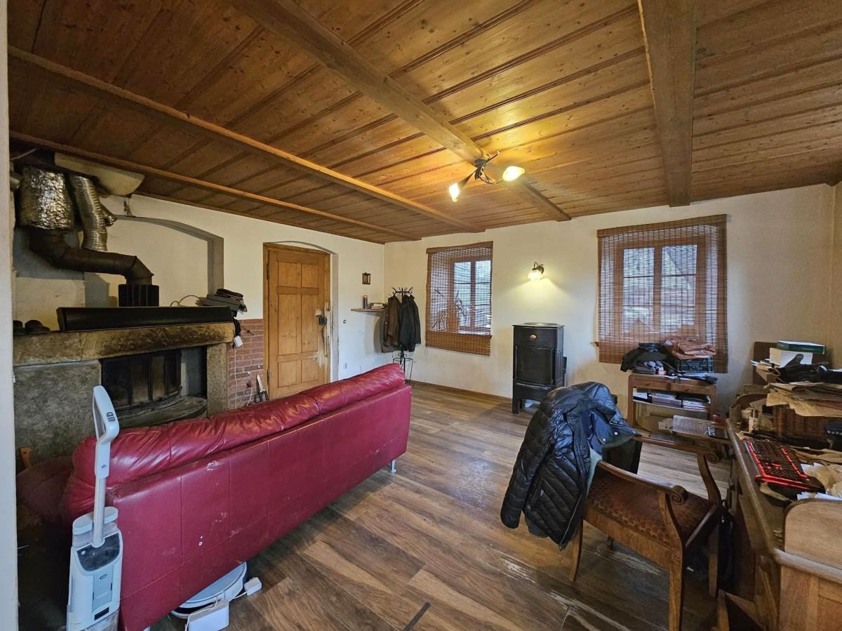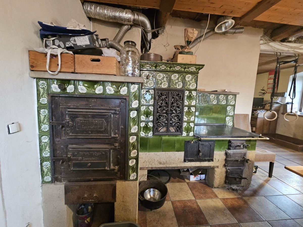 - salon połączony z kuchnią w której jest stary kuchenny piec